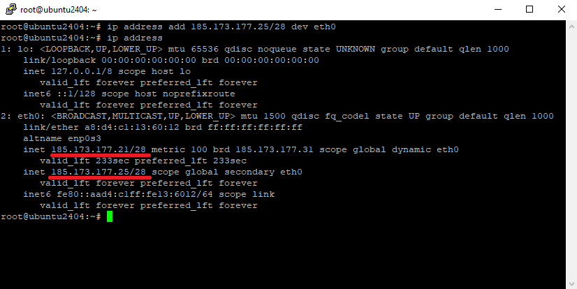 Если вы всё сделали правильно, IP-адрес добавится на сетевую карту сервера. Выполните команду ip address, чтобы получить список IP-адресов