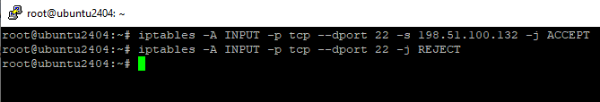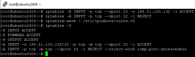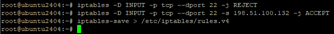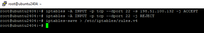 iptables -A INPUT -p tcp --dport 22 -s 198.51.100.132 -j ACCEPT